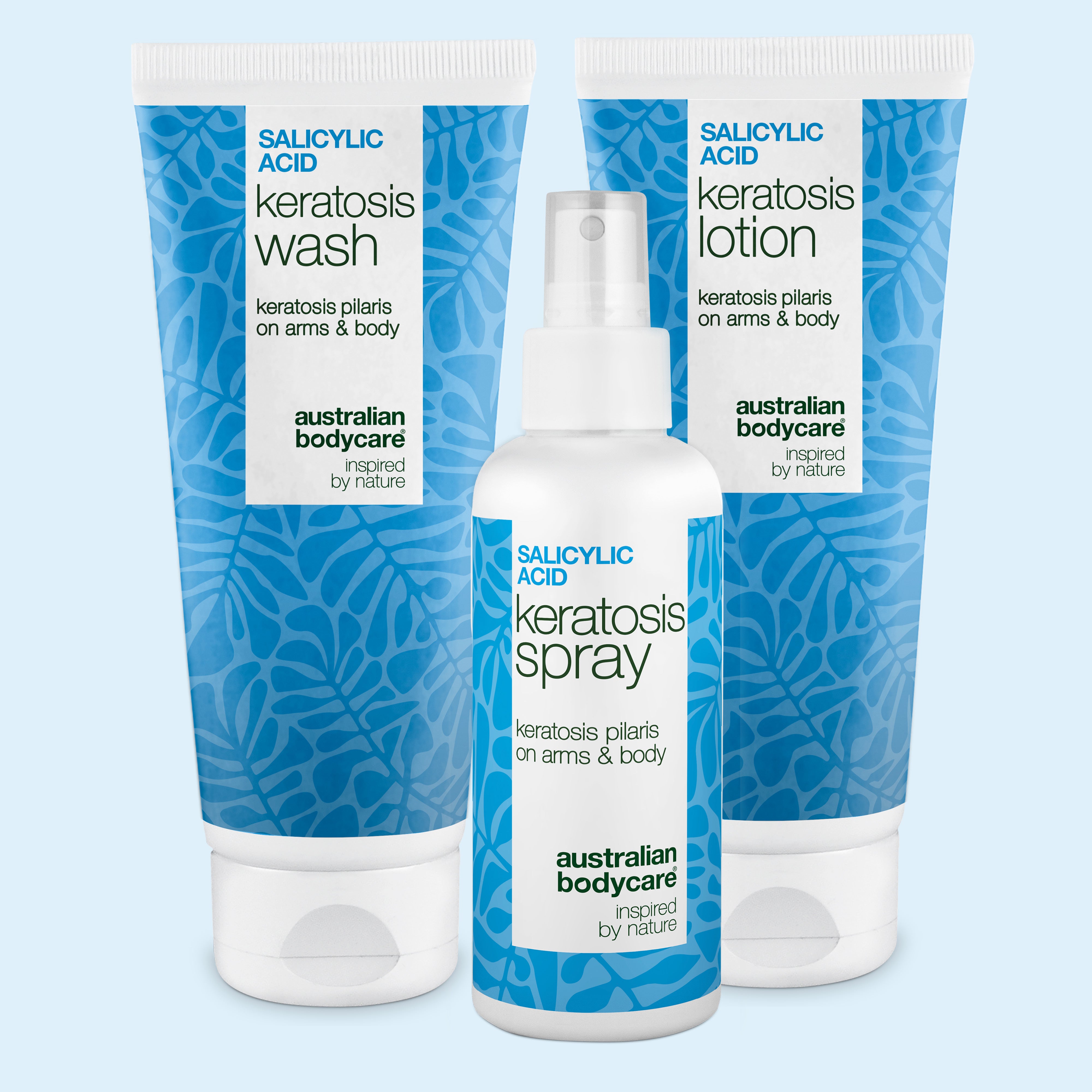 Keratosis pilaris, joka tunnetaan myös nimellä "kananliha", on yleinen ihotila, joka voi aiheuttaa pieniä, karheita näppylöitä iholla. Australian Bodycare tarjoaa tuotteita, jotka on erityisesti kehitetty hoitamaan ja pehmentämään keratosis pilaris -ihoa. Valikoimamme sisältää hellävaraisia ja tehokkaita ratkaisuja, jotka auttavat poistamaan kuolleita ihosoluja ja parantamaan ihon rakennetta.